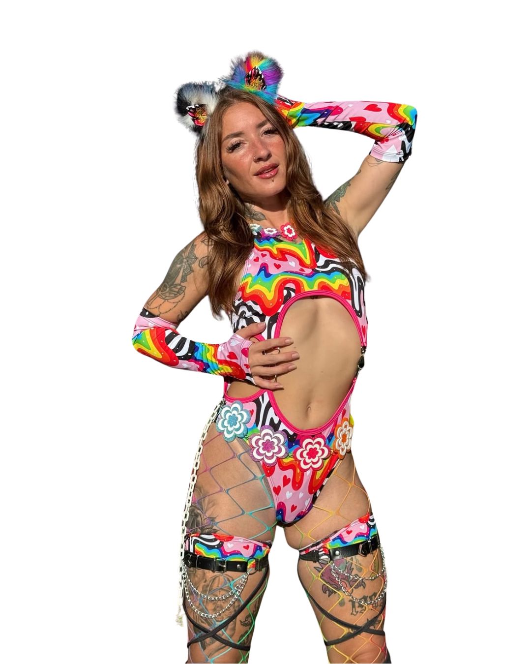 The Hypnotic Daisy set is a psychedelic statement piece featuring layered glitter acrylic daisies in a full rainbow spectrum. The vibe is ✨bold✨ and trippy.